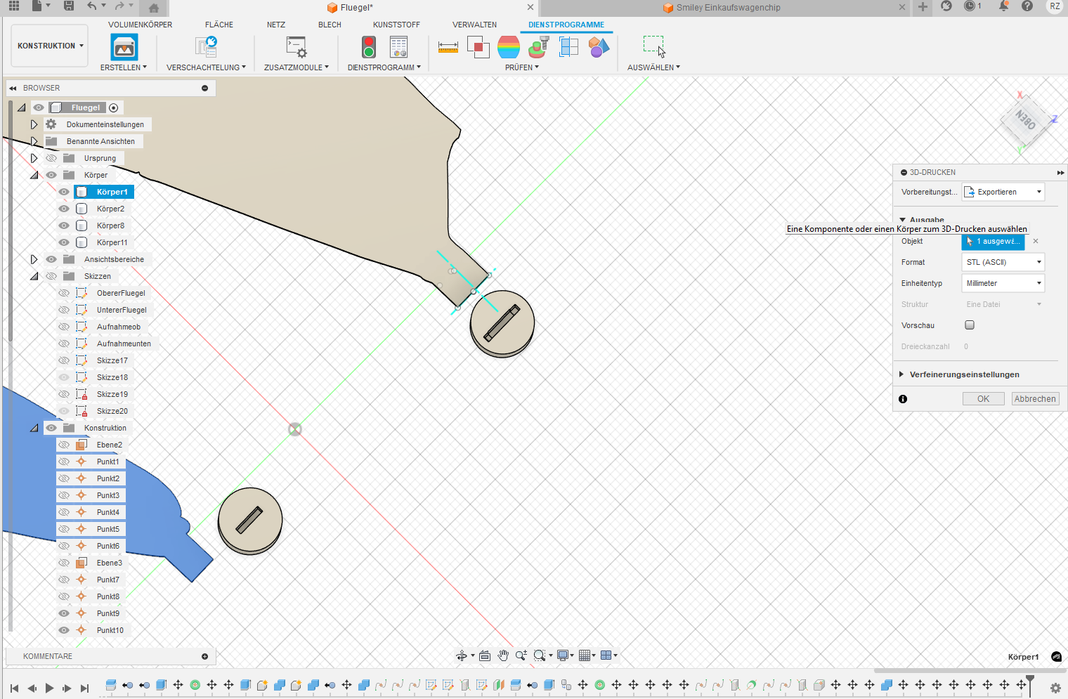 I drew tangential lines along the picture of the wings. Afterwords i extruded the surface area of the wings by 1mm. 1mm was the best fitting for some felxibility but the wing can still withstand a reasonable amount of stress before it plastically deformates. I cutted and extruded the edges of the wing that normally connect the wings to the muscle of the dragonfly, so that i can fit them more stable in the connection for the ball joint, which was a cylinder with a pasfit for the wing and an smaller cylinder to connect it again via pasfit to the balljoint.