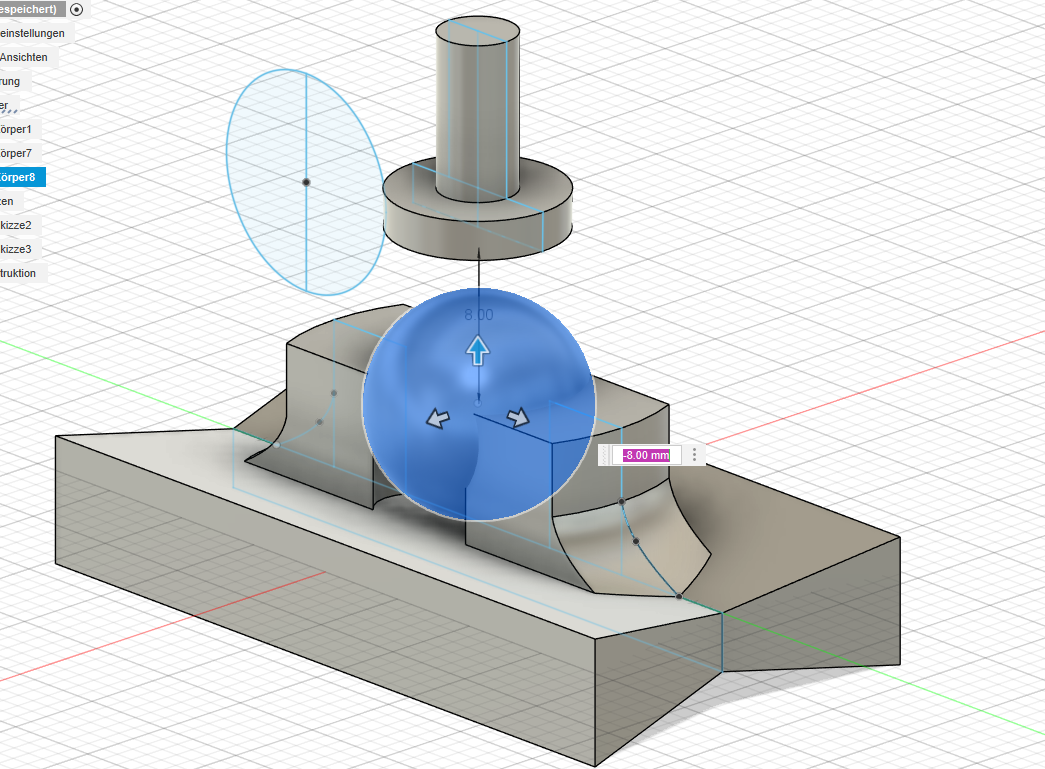 My Idea was to create a base that would have an narrow holding mechanism for the ball. This would reduce the area that limits the movement of the ball. It would need to be high enough so the ball would not fall out but with the most possible range of motion. I knew that my structure would be around a spheric object so i used the rotation function from Fusion360 to crate an proper surrounding for the ball. The next steps where clear: create a base,a ball and the possibilty to connect something with it i handled it all in Fusion360. altough I had some major problems with the software and was working really slow, due to the lack of experience, it took a really long time to get a final result that suited my idea.